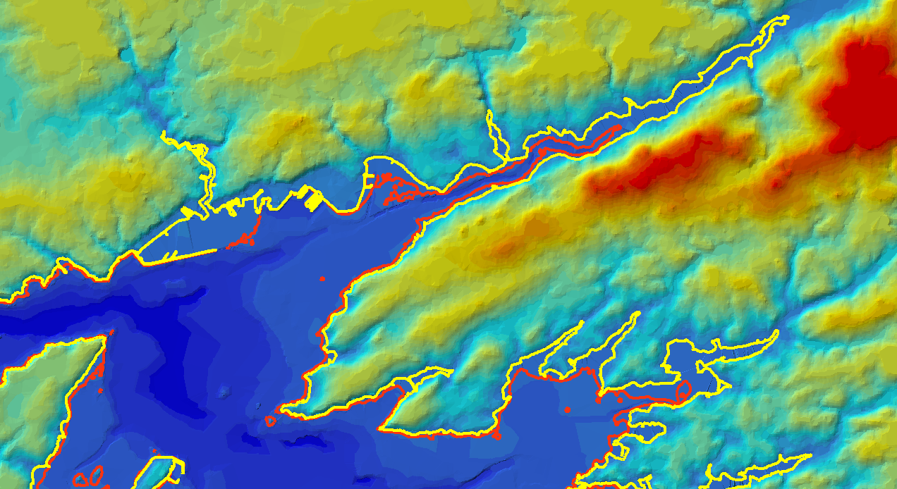 Pour comprendre la complexité du problème il suffit de regarder sur une carte la hauteur du 0 terrestre (dans la figure elle est représentée en jaune) et de la profondeur 0 de la carte marine correspondante (dessinée en rouge).
