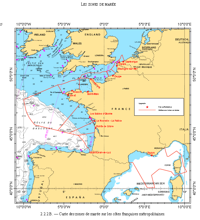 Vous trouverez sur le site du Service hydrographique et Océanographique de la Marine (SHOM), à l’adresse www.shom.fr, un ouvrage téléchargeable gratuitement, le document « Références Altimétriques Maritimes ». Dans cet ouvrage, en plus de toutes les explications techniques, vous trouverz une carte des zones de marée avec l’indication du port de référence de chaque zone.