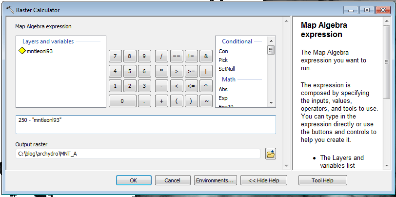 On va inverser le MNT en soustrayant 250 à chaque cellule du MNT. Pour cela on utilise la calculatrice raster de Spatial Analyst.