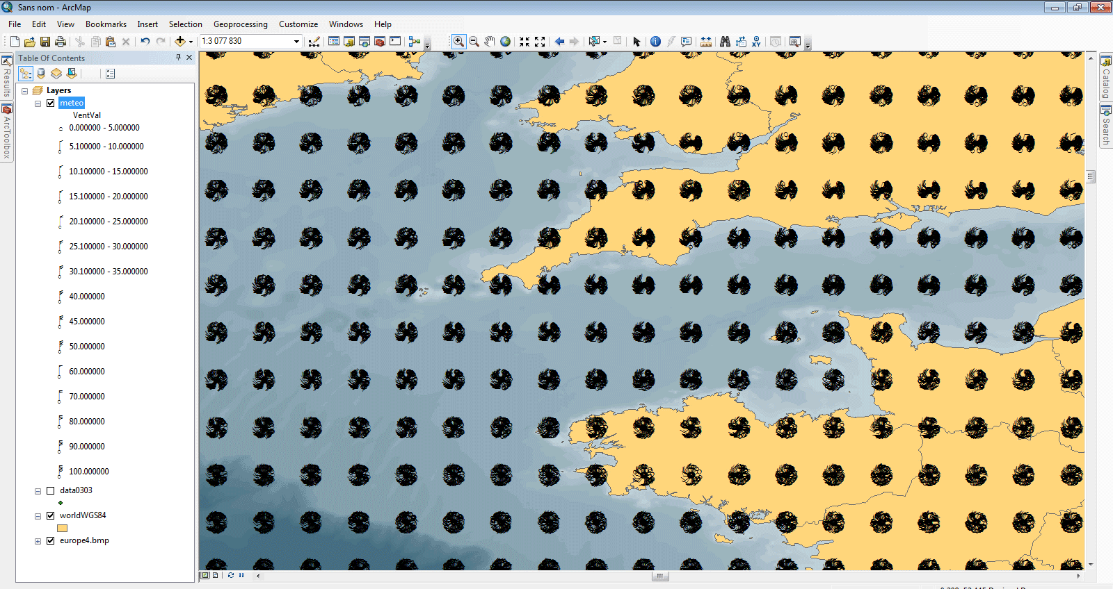 Pour qu’ArcMap puisse gérer les différents pas de temps d’une couche, il lui faut pouvoir distinguer les enregistrements qui concernent un seul pas de temps. C’est l’équivalent de ce que vous faites en utilisant la requête de définition présente dans la couche vent.lyr. Celle-ci permet de sélectionner les enregistrements correspondants à une date et une heure donnée.