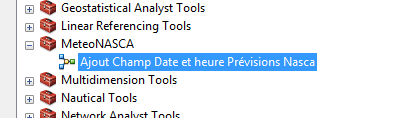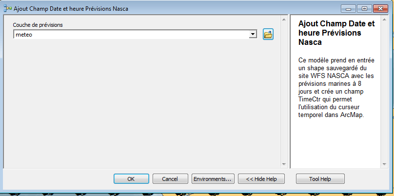Pour le moment, la gestion du temps d’ArcMap ne peut pas utiliser plusieurs champs pour réaliser cette distinction. Il lui faut un seul champ contenant l’information du pas de temps. Dans notre cas, nous en avons deux : « MeteoDate » et « heure ».